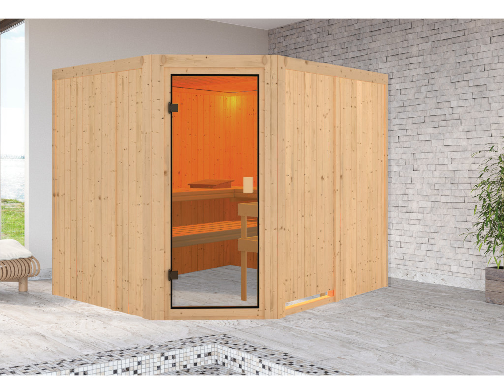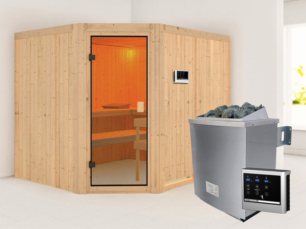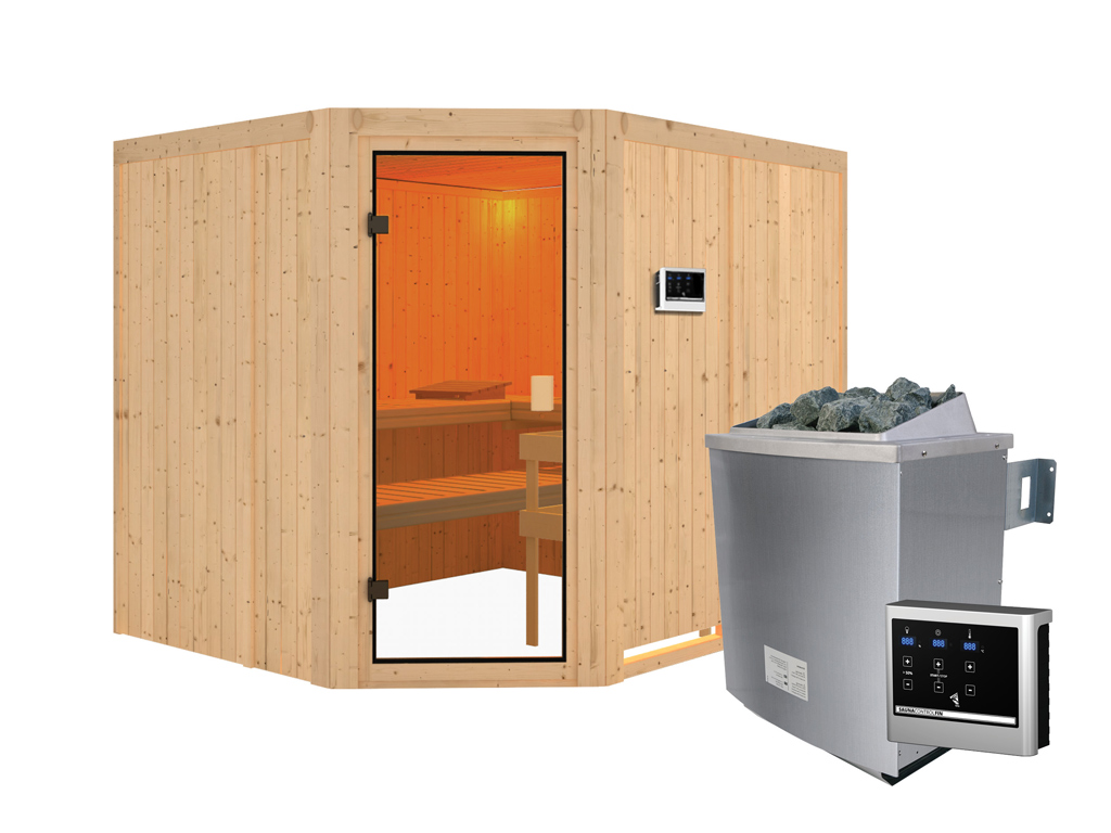 Deze binnensauna is voorzien van een saunakachel met een externe bedieningsunit. De bedieningsunit is buiten de sauna geplaatst. Zo begint het comfort al vóór het saunabezoek–met comfortabele bediening van buitenaf en een nog preciezere temperatuurinstelling. Ook andere elektrische apparaten, zoals de cabineverlichting, kunnen op de externe bedieningsunit worden aangesloten en bediend.