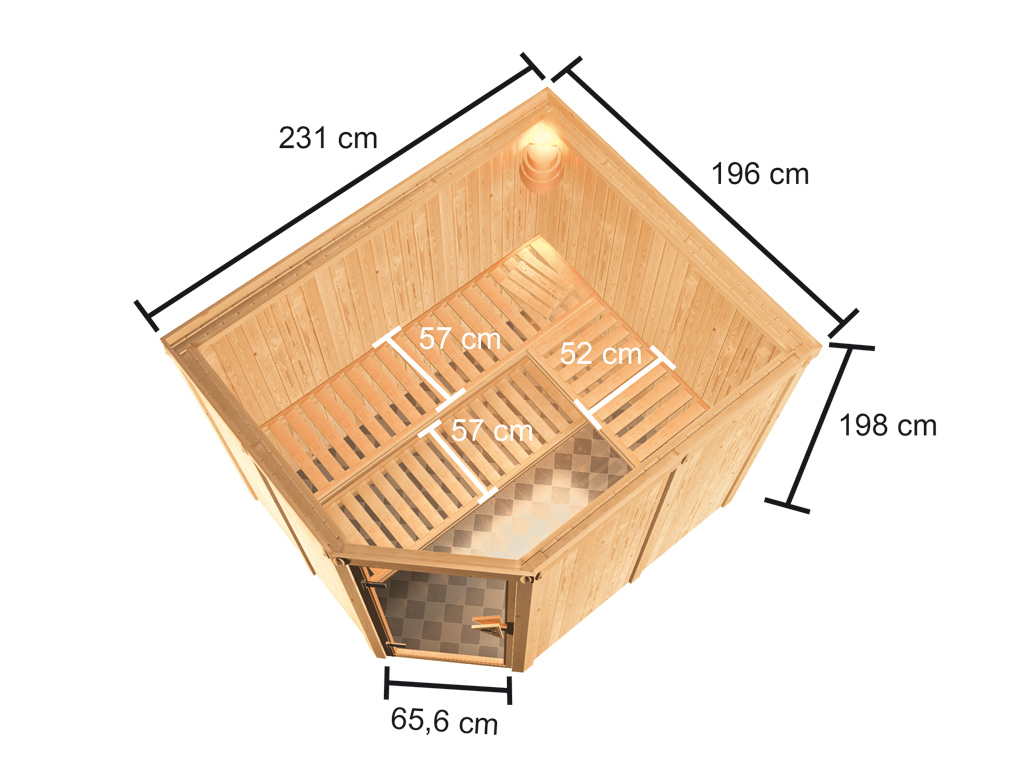 - Saunaligbanken: Met 3 ligbanken wordt de ervaring voor elke saunagast bijzonder aangenaam. De basisuitrusting omvat de volgende ligbanken: 2 ligbanken, elk ca. 57 cm breed, 1 dwarsligbank, ca. 52 cm breed, massief vurenhout.