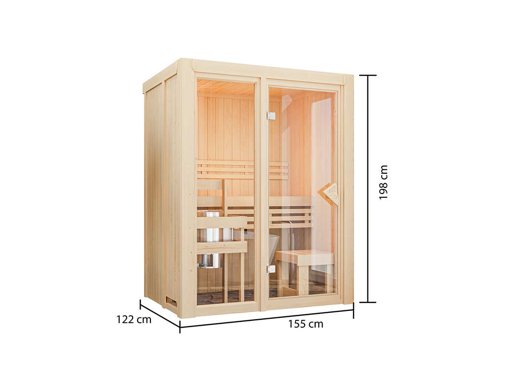 B x D x H: 155 x 122 x 199 cm, vooringang, incl. 1 ligstoelen, incl. 3,6 kW kachel met externe bediening