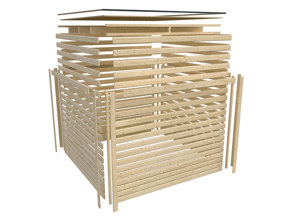 De twee extra lange banken en het dwarsligbed van stevig espeshout verhogen het comfort in dit saunahuis. Daarnaast is een kachelbeschermrooster van massief dennenhout en een massieve houten vloer inbegrepen.