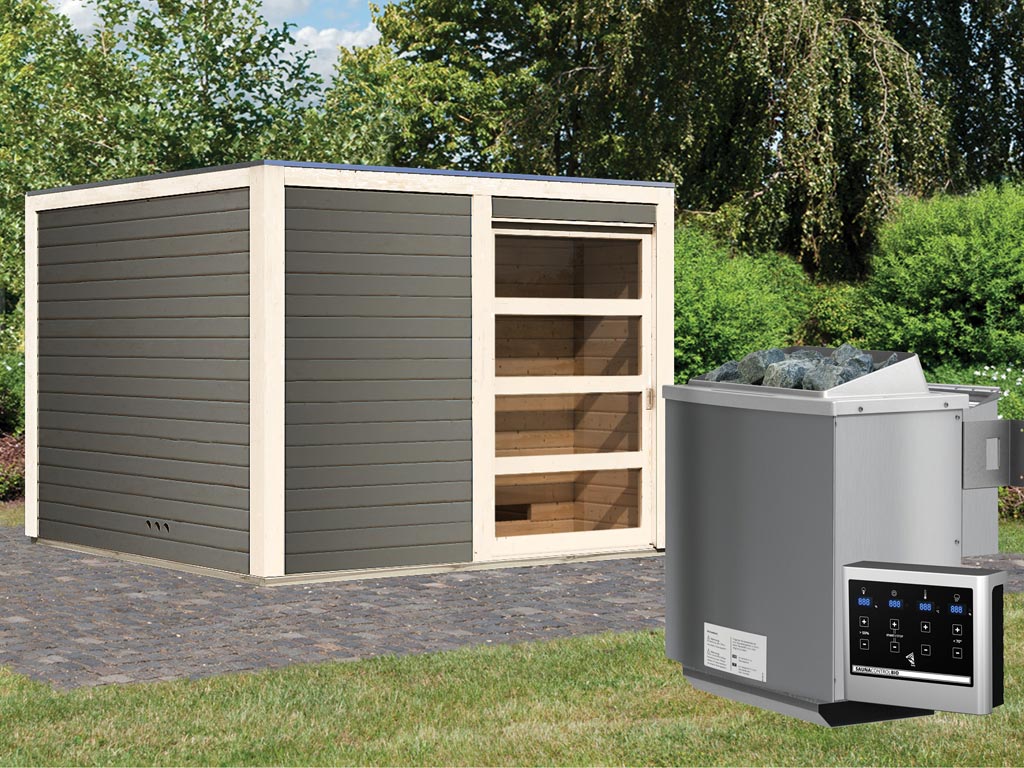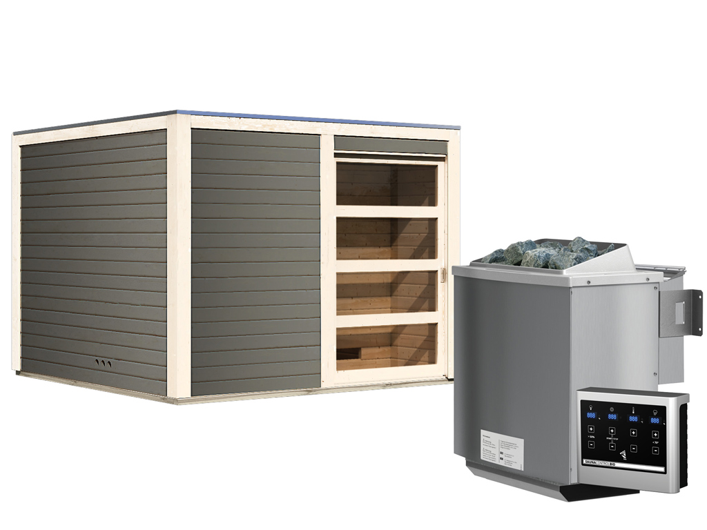 Saunahaus Cuben 38 mm terragrijs incl. 9 kW Bio-Combi-kachel ext. besturing
