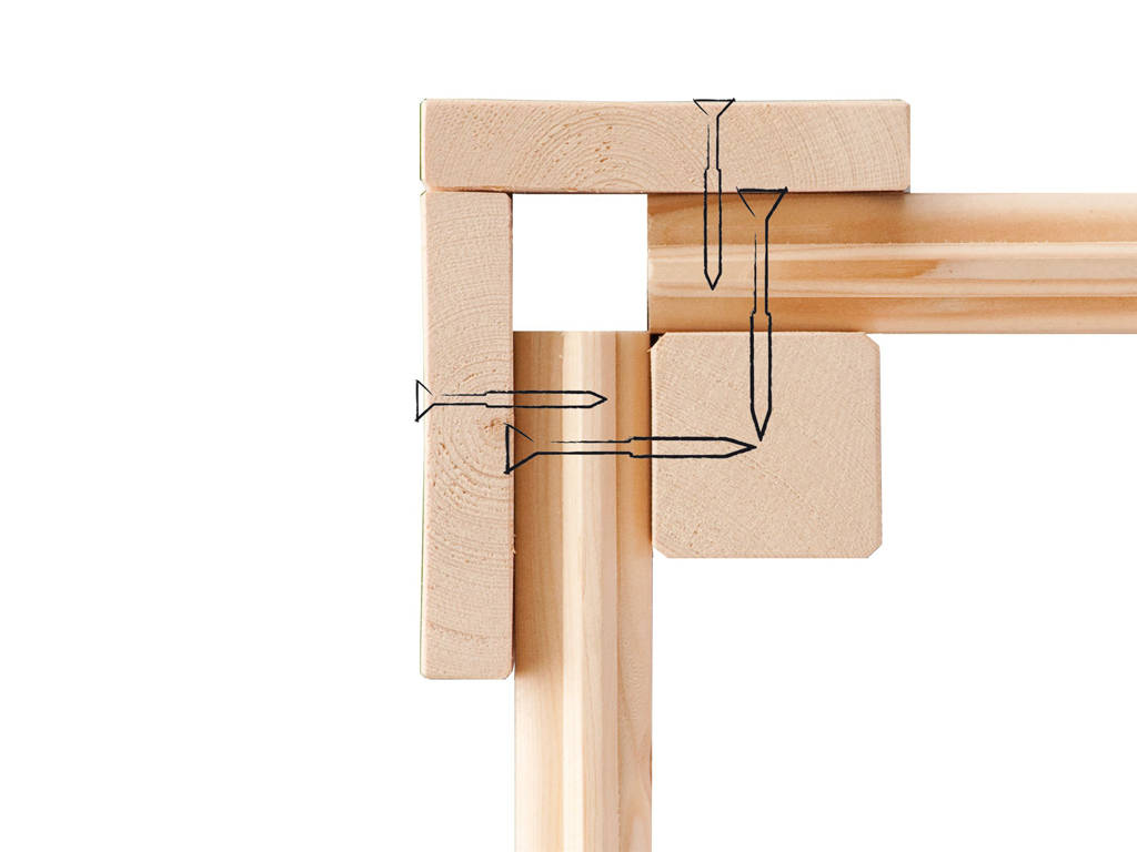 De twee extra lange bankligstoelen en de dwarsligstoel van stabiel esp hout verhogen het comfort in dit saunahuis. Daarnaast zijn een kachelbeschermrooster van massief dennenhout en een massieve houten vloer inbegrepen.