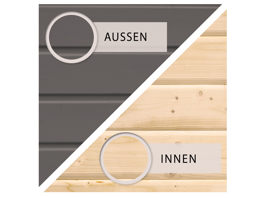 De twee extra lange bankligstoelen en de dwarsligstoel van stabiel esp hout verhogen het comfort in dit saunahuis. Daarnaast zijn een kachelbeschermrooster van massief dennenhout en een massieve houten vloer inbegrepen.