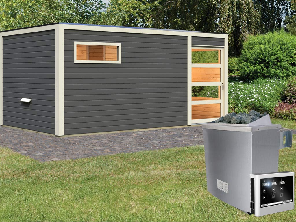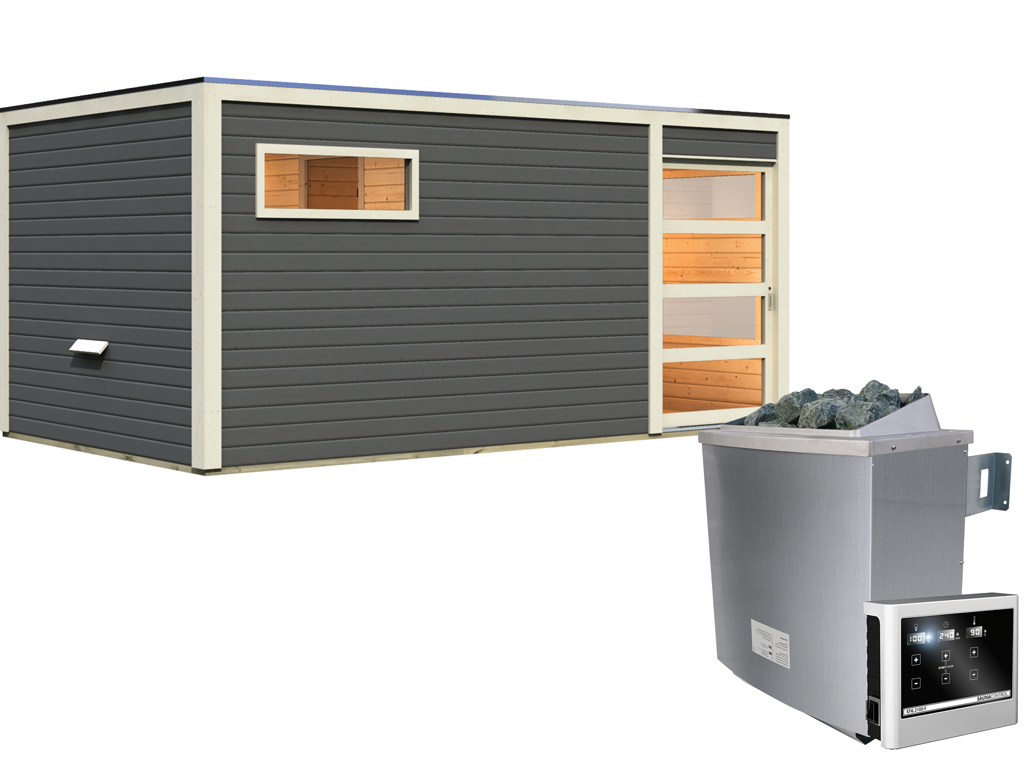 Saunahuis Hygge grijs met Schiebetür & voorkamer, incl. 9 kW saunakachel met ext. besturing