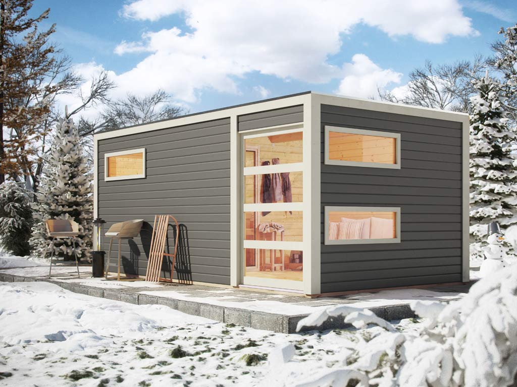 Saunahaus Hygge grijs met Schiebetür & voorkamer, incl. 9 kW saunakachel met ext. besturing