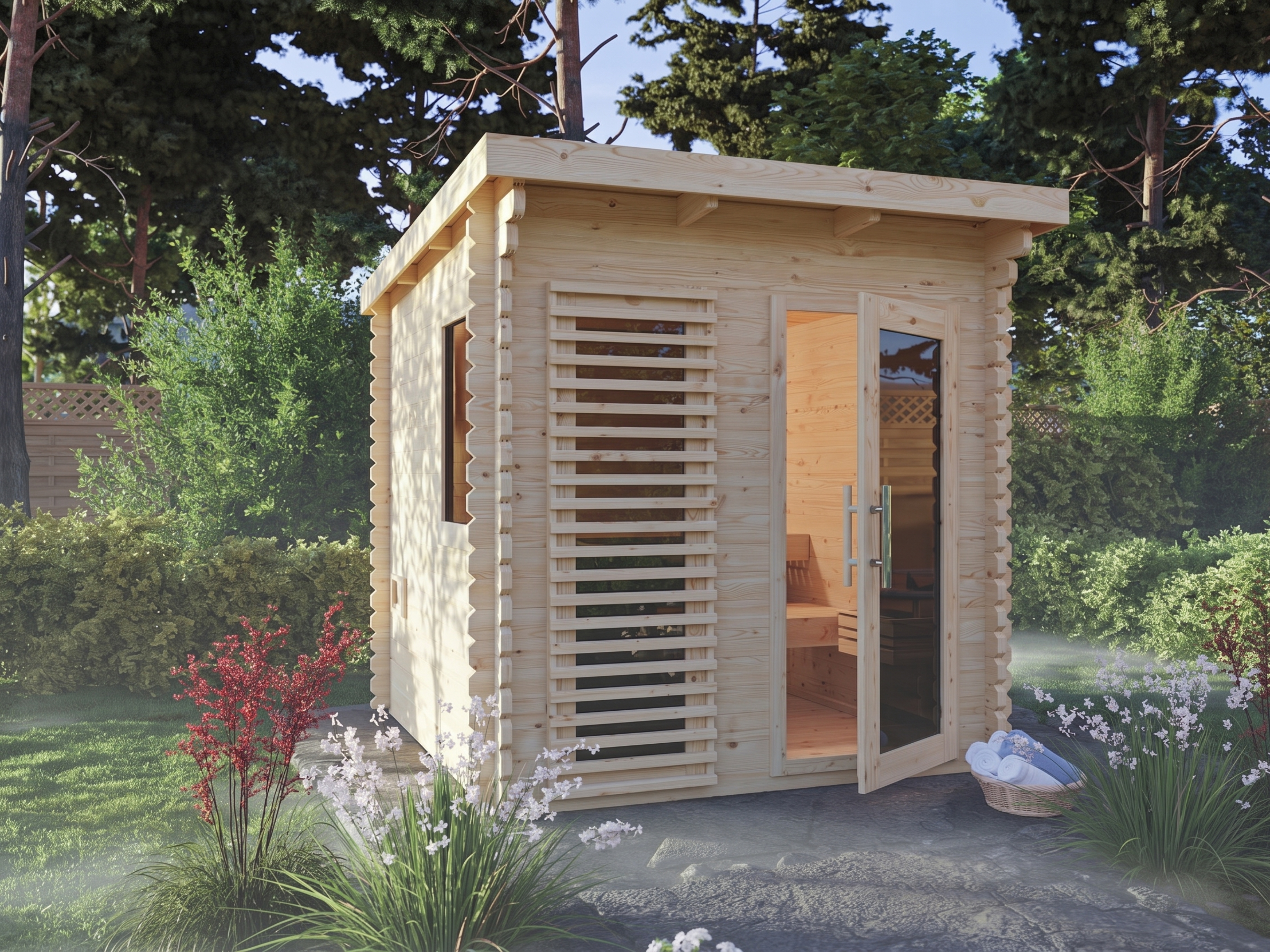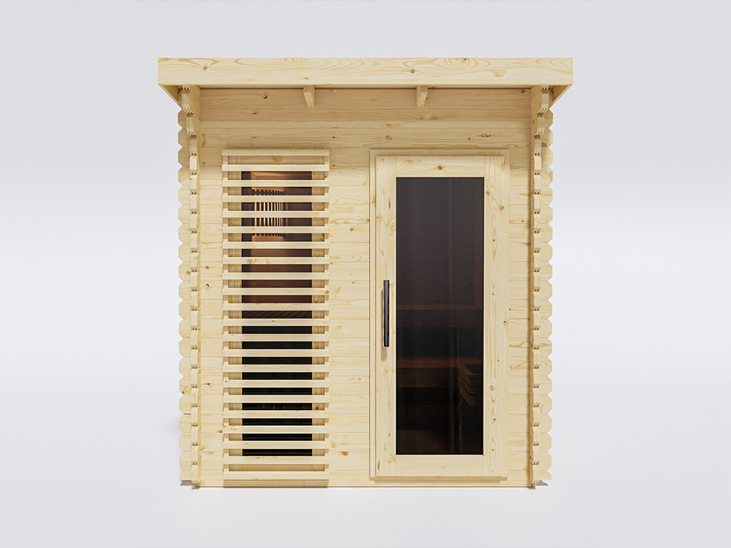 Deze buitensauna is voorzien van een stevige grafiet glazen deur met een houten frame van massief Scandinavisch vurenhout.