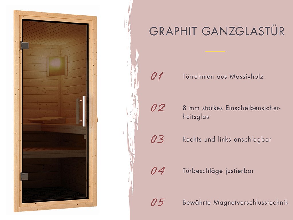 | Leveringsomvang: | 3 ligbanken, 1 hoofdsteun, saunakachel met ext. bediening en saunastenen |