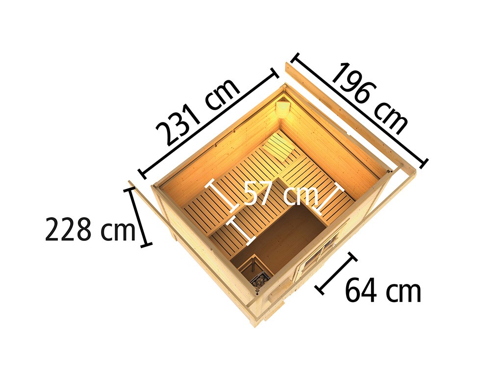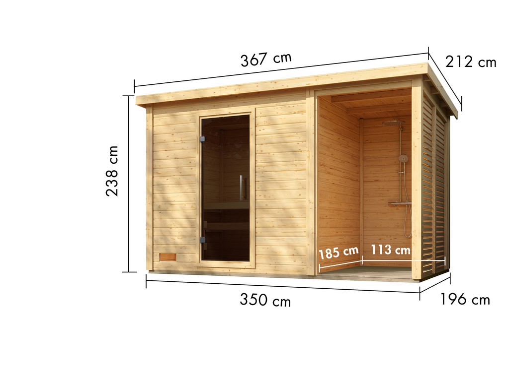 B x D x H: 367 x 212 x 238 cm, incl. 3 ligbanken, 1 hoofdsteun, saunakachel met externe bediening en saunastenen