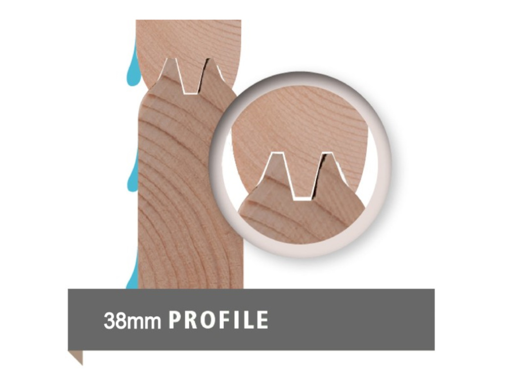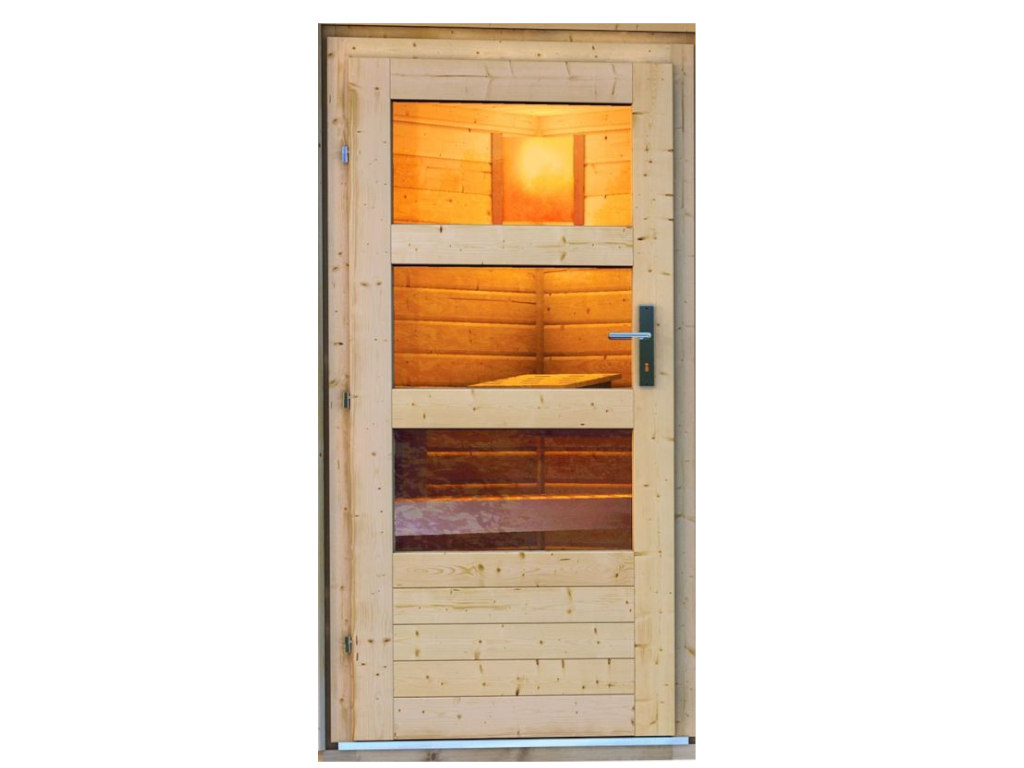 De deur van helder en geïsoleerd glas is links scharnierend en wordt geleverd met een cilinderslot inclusief 3 sleutels. De drie lichtuitsparingen zorgen voor voldoende licht in je sauna.