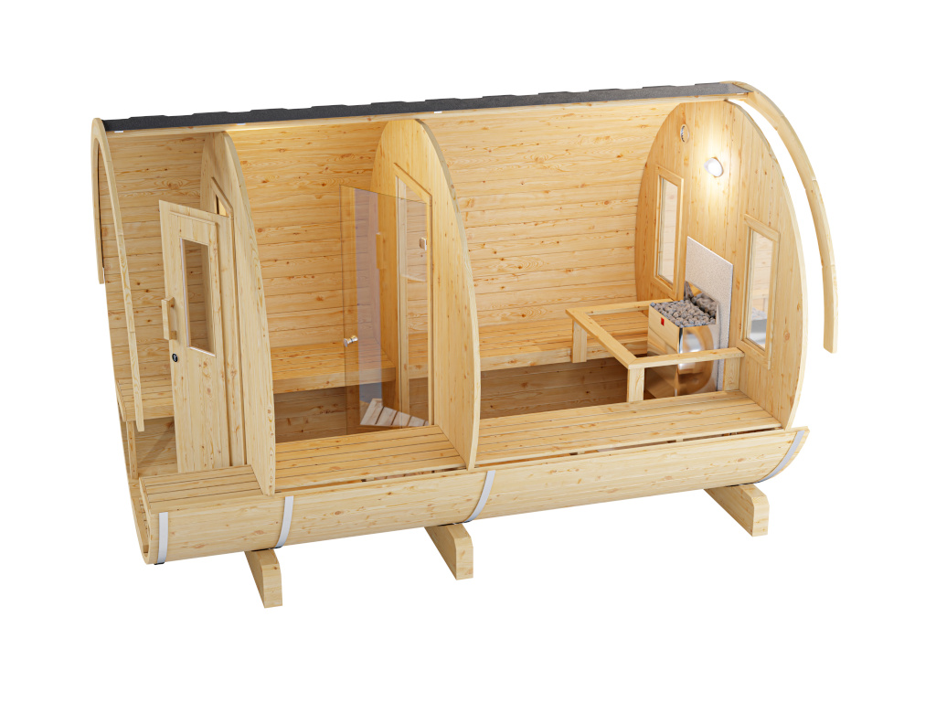 | Leveringsomvang: | incl. 2 ligstoelen, 9 kW bio-oven, externe bediening, stenen |