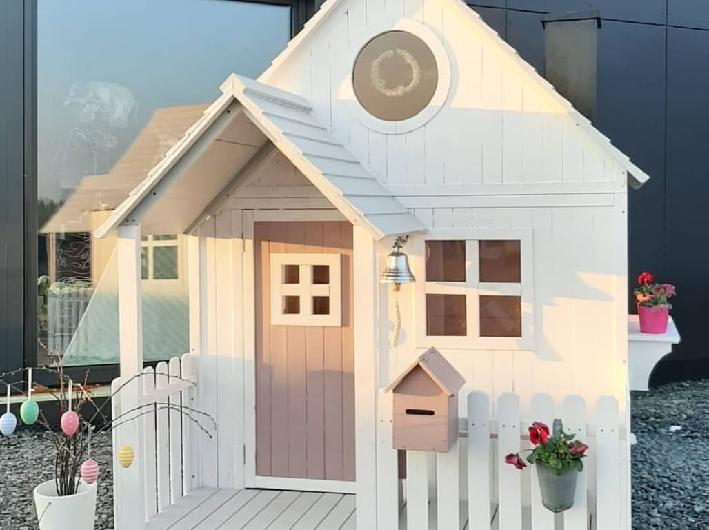 Het speelhuisje van Aziatisch naaldhout wordt al tweekleurig in wit en transparant gebeitst geleverd (één laag). Het speelhuisje moet echter zo snel mogelijk – bij voorkeur nog vóór de montage – binnen en buiten met een extra laag transparante houtbeschermingsbeits worden behandeld. Voor langdurig speelplezier met het speelhuisje is het aan te raden deze behandeling eenmaal per jaar te herhalen.