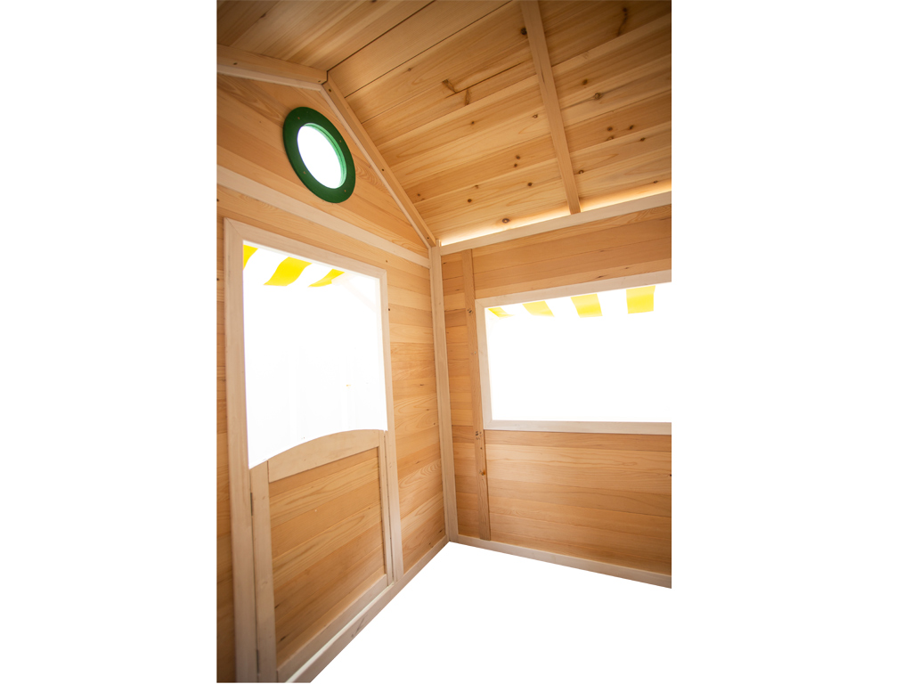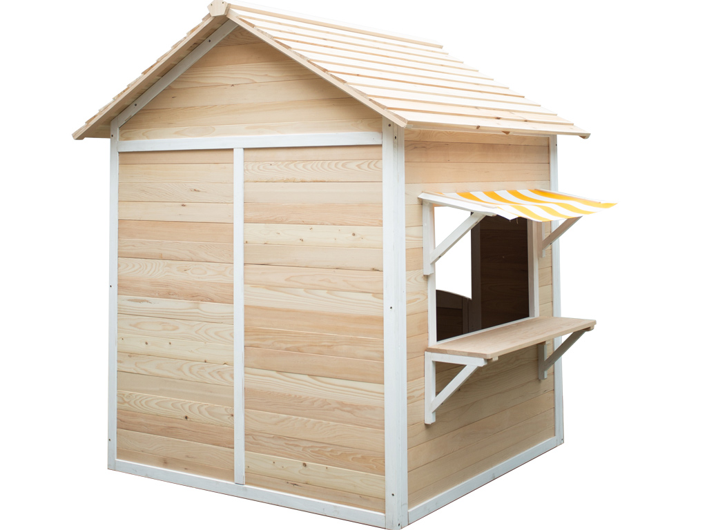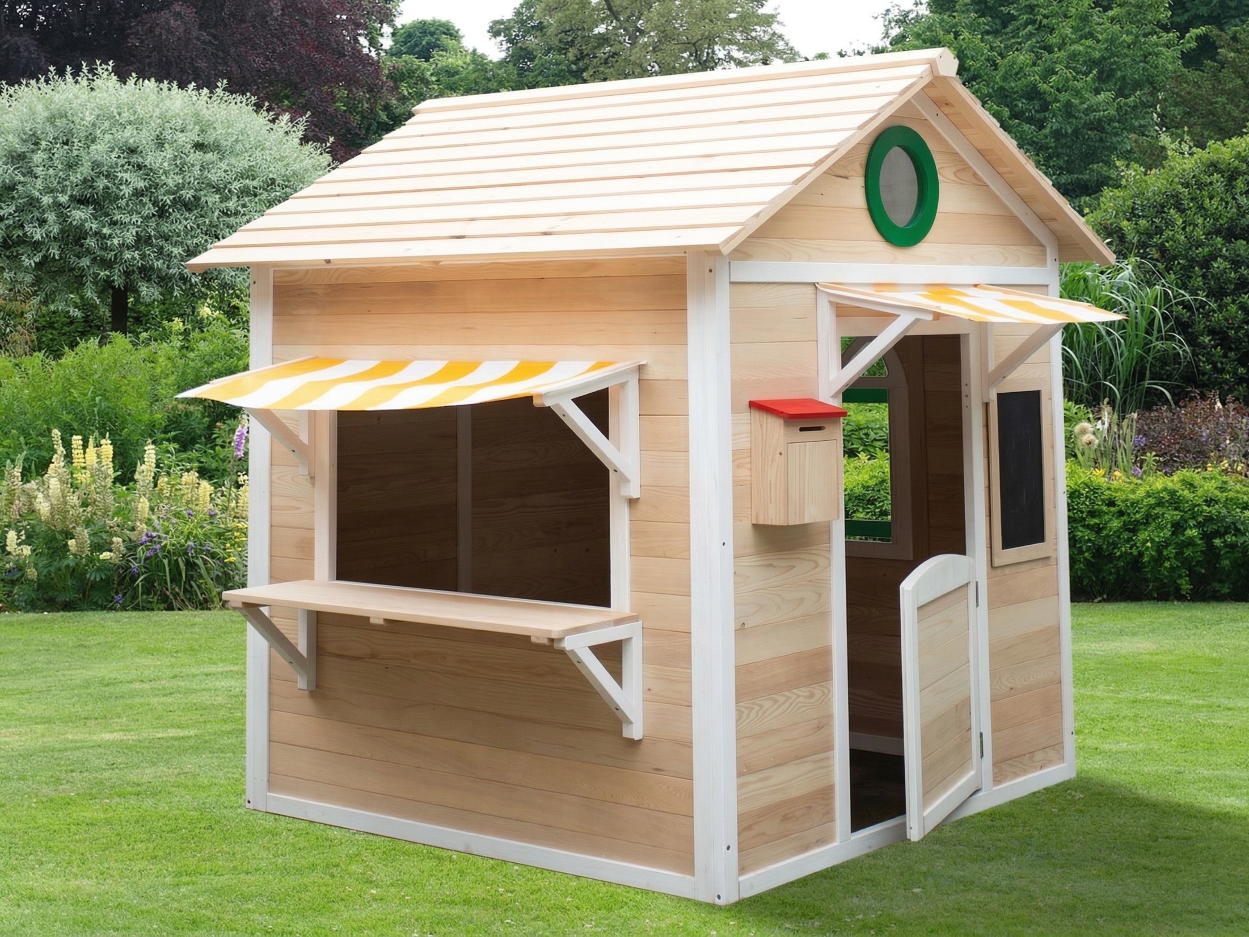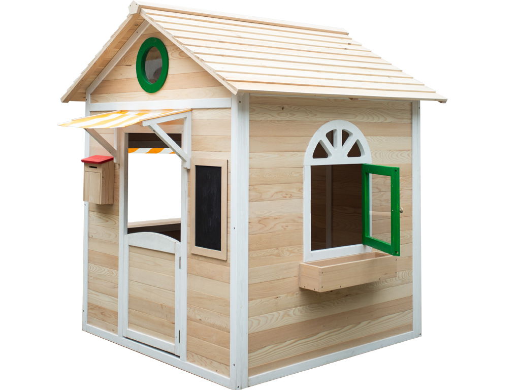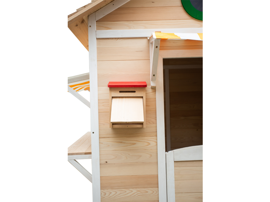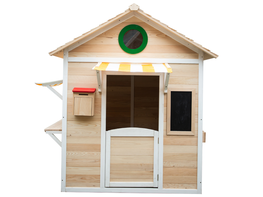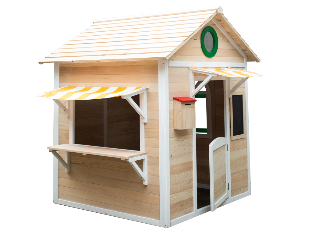 Het speelhuis is uitgerust met een open verkoopvenster inclusief een toonbank. De geel/witte foliedaken boven het verkoopraam en de deur versterken het marktkraamkarakter. In de andere zijwand is een venster voor het openen (kunstglas) aangebracht. Aan de voorzijde bevindt zich een vast rond raam (kunstglas) boven de deur. - incl. brievenbus, schoolbord & bloembak