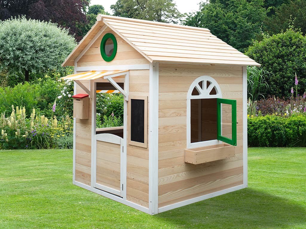 Voor nog meer speelplezier is het speelhuis uitgerust met een brievenbus, een schoolbord en een bloembak onder een raam. - Eenvoudige en snelle montage