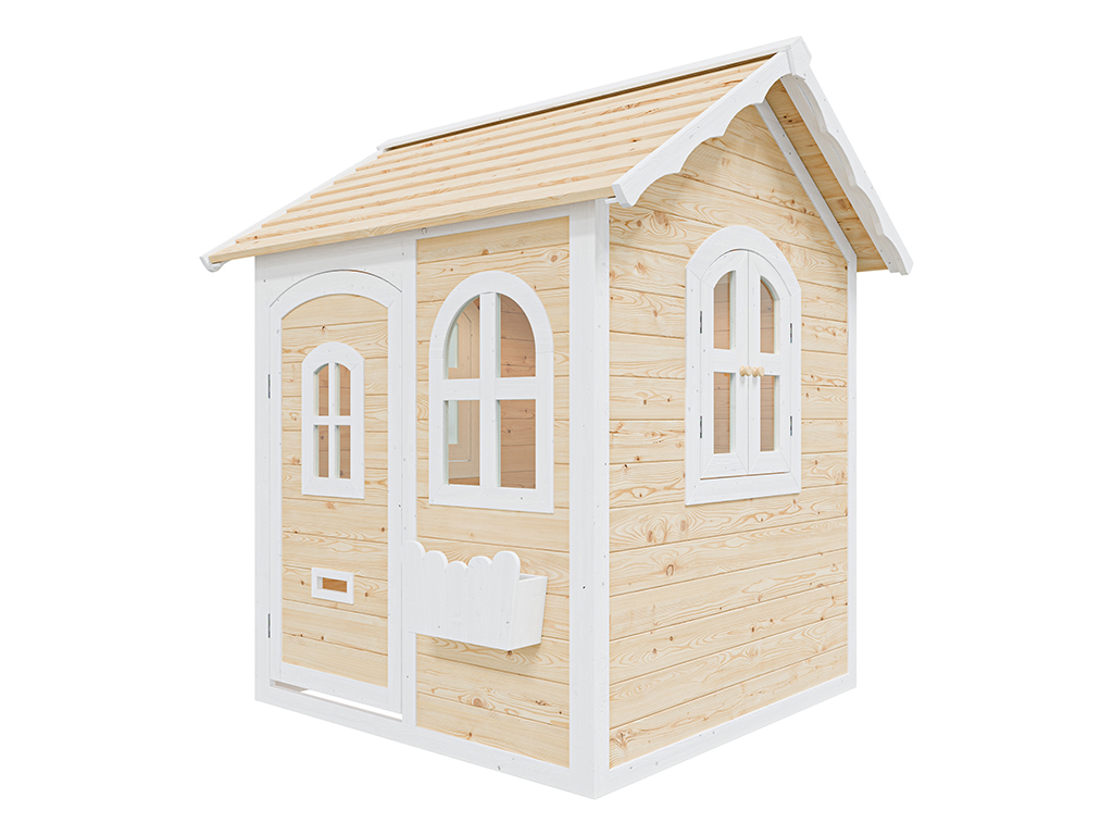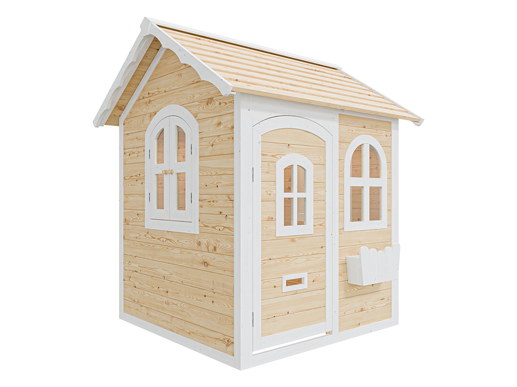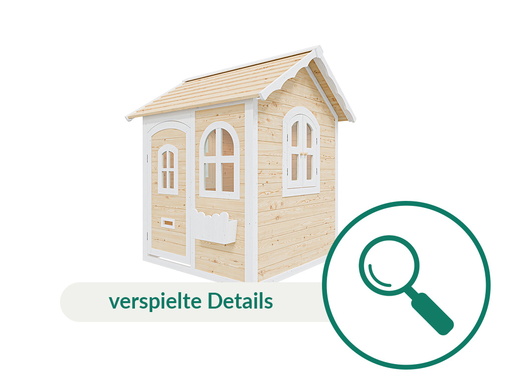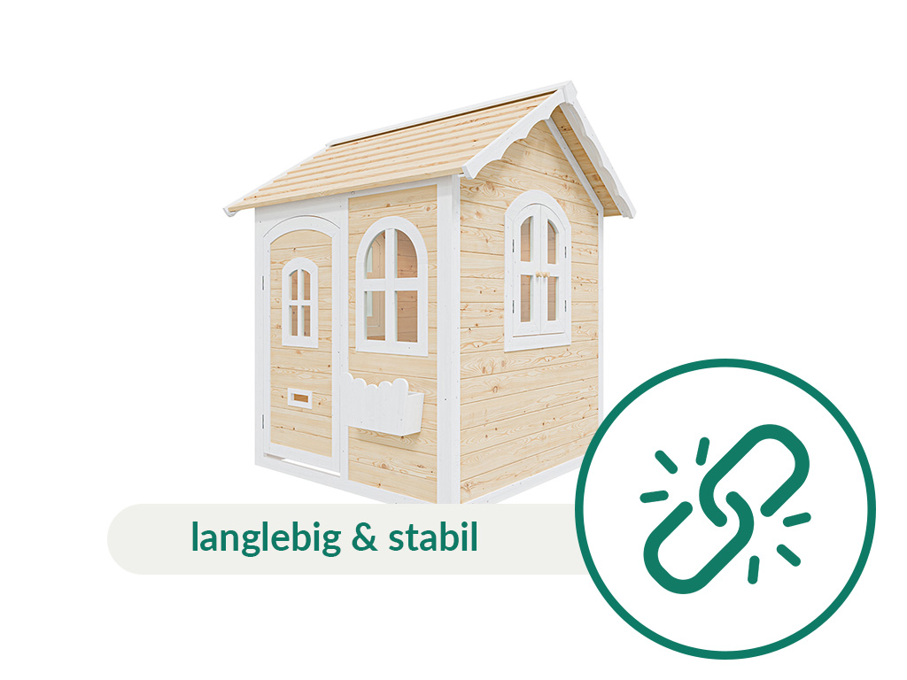 De gedetailleerde en gemakkelijk te begrijpen instructies maken een snelle montage mogelijk. - Het speelhuis van Aziatisch naaldhout wordt al in twee kleuren geleverd: wit en transparant gelazuurd (1 laag). Het speelhuis moet echter op korte termijn – bij voorkeur vóór de montage – van binnen en van buiten worden behandeld met een extra laag transparante houtbeschermingsbeits. Voor langdurig plezier van het speelhuis is het aan te raden om jaarlijks een nieuwe laag aan te brengen.