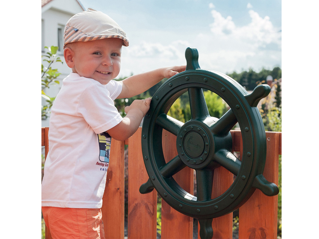 De speeltoren is vanaf de ene kant te beklimmen met een brede klimhelling met klimstenen en klimtouw en vanaf de andere kant via een tweedelige ladder van houten of metalen sporten, elk voorzien van een leuning. - Incl. zandbak, telescoop en stuurwiel