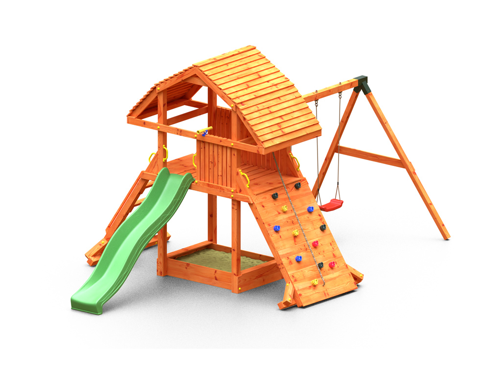 De basisconstructie van de speeltoren is bijzonder weerbestendig. De massieve 9 x 9 cm sterke palen van robuust naaldhout zijn onder druk behandeld en daarna geverfd in de kleur teak. De speeltoren is dus al beschermd tegen weersinvloeden en ongedierte en heeft geen verdere nabehandeling nodig. - Eenvoudige constructie