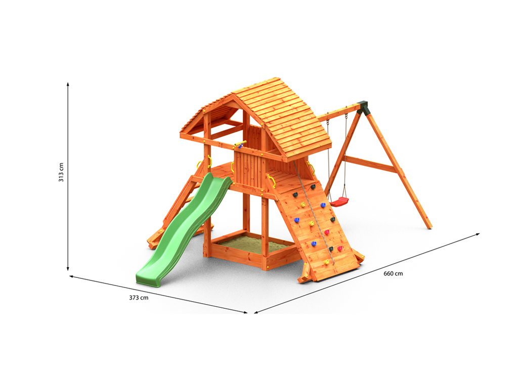 B x D x H: 373 x 660 x 313 cm, incl. Glijbaan groen, incl. Dubbele schommel