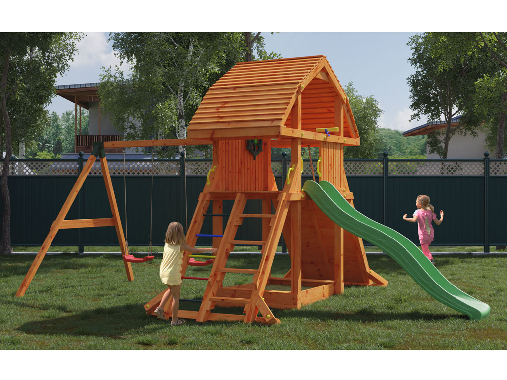 Speeltoren SPAARSET XXL Giant teak incl. glijbaan groen + dubbele schommel