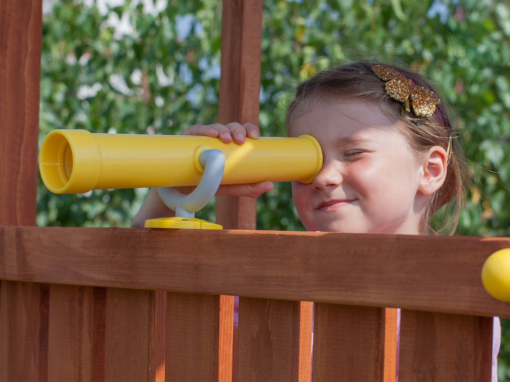 Onder de speeltoren bevindt zich een grote zandbak met twee planken. Ook inbegrepen zijn een speelgoedtelescoop en een stuur. - Incl. grondankers+ handgrepen