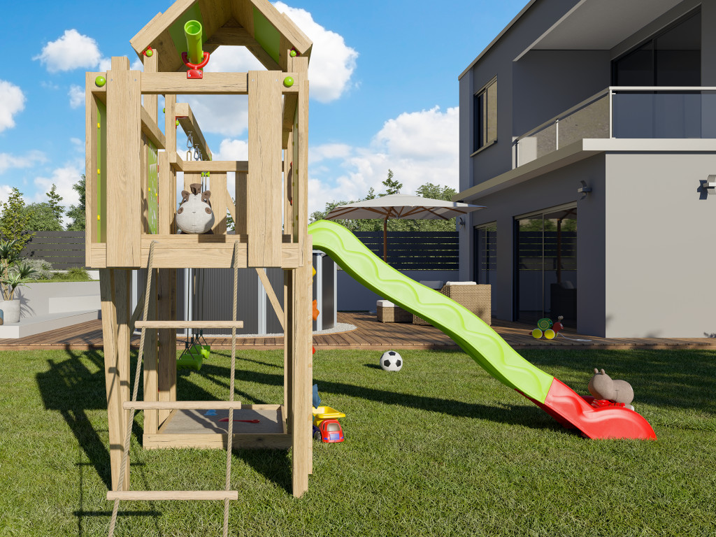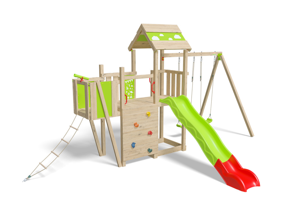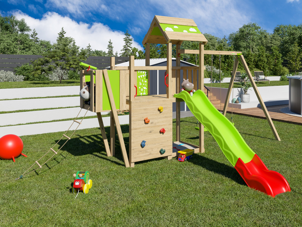 Speeltoren Louanne incl. dubbele schommel, klimwand + glijbaan groen-rood