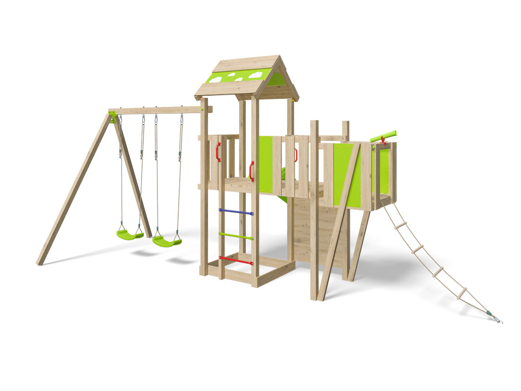 De speeltoren is voorzien van een dubbele schommel met twee groene schommelzitjes. De basisconstructie van de schommelaanbouw bestaat uit een 9 x 9 cm dikke dwarsbalk en 7 x 7 cm dikke paal. De schommelzitjes zijn in hoogte verstelbaar. - Klimmogelijkheden