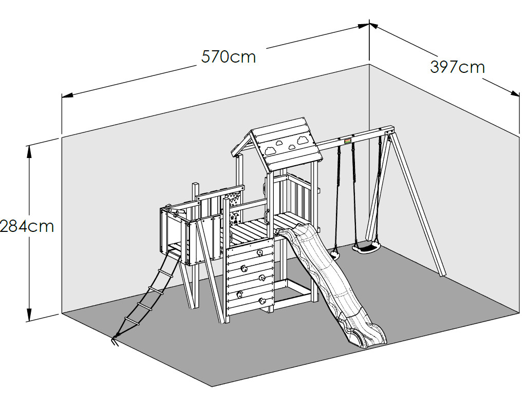b x d x h: 570 x 397 x 284 cm, incl. glijbaan + dubbele schommel, incl. klimwand + zandbak + touwladder en nog veel meer.