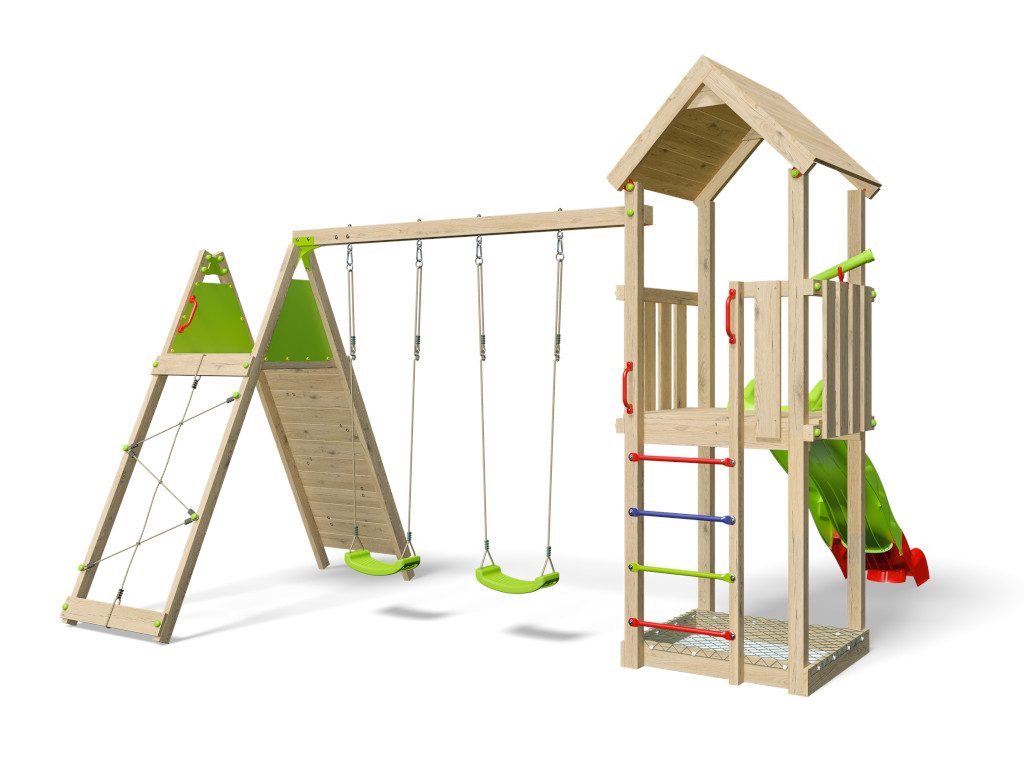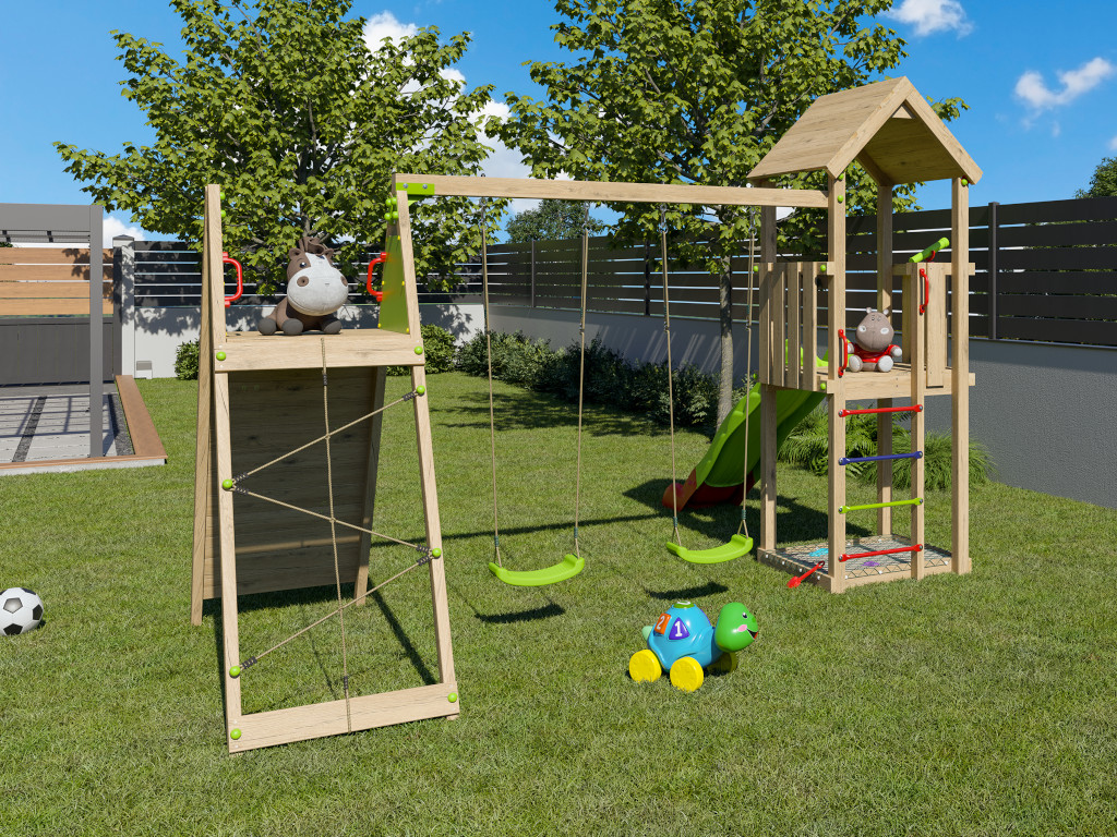 De speeltoren is voorzien van een dubbele schommel met twee groene schommelzitjes. De basisconstructie van de schommelaanbouw bestaat uit een 9 x 9 cm dikke dwarsbalk en 7 x 7 cm dikke paal. De schommelzitjes zijn in hoogte verstelbaar. - Klimmogelijkheden