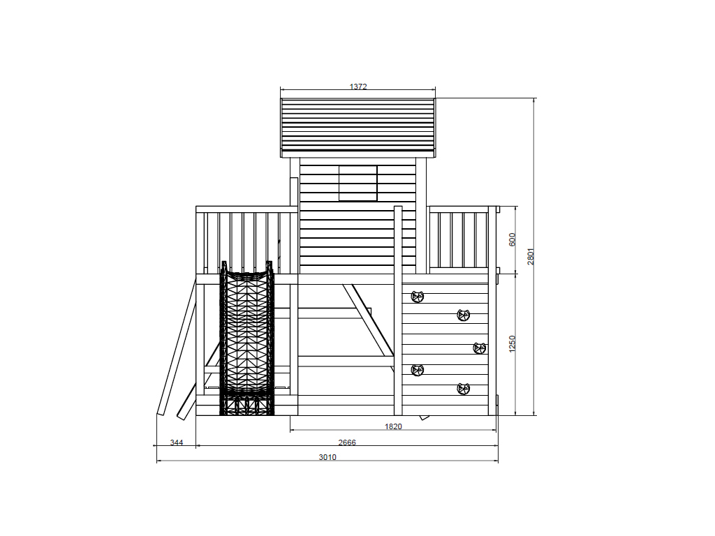 De vereiste 6 grondankers voor het bevestigen van de torens in de grond evenals 6 handgrepen zijn reeds inbegrepen in de levering. Rondom is het paalhuis voorzien van een 60 cm hoge balustrade. De ladder is voorzien van afgeronde metalen sporten, waardoor het risico op houtsplinters en scherpe randen minimaal is. Het speelhuis wordt verder geleverd met afdekkappen voor de schroefverbindingen - Gekleurd voorbehandeld
