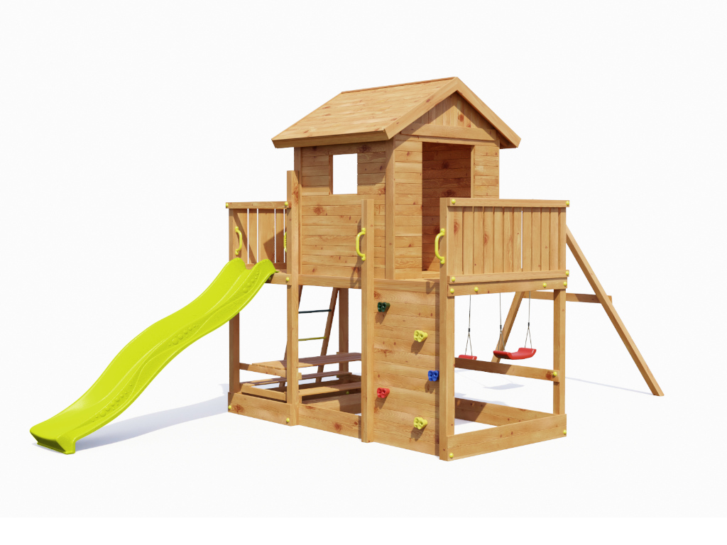 Deze speeltoren combineert speeltoren met speelhuis. De speeltoren heeft twee platforms die aan de ene kant via een ladder en aan de andere kant via een klimwand met klimstenen beklommen kunnen worden. Op het platform staat een overdekt speelhuis met twee ingangen en een raampartij. - Incl. glijbaan