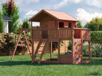 Deze speeltoren combineert speeltoren met speelhuis. De speeltoren heeft twee platforms die aan de ene kant via een ladder en aan de andere kant via een klimwand met klimstenen beklommen kunnen worden. Op het platform staat een overdekt speelhuis met twee ingangen en een raampartij. - Incl. glijbaan