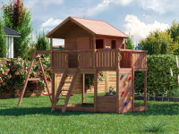 De vereiste 6 grondankers voor het bevestigen van de torens in de grond evenals 6 handgrepen zijn reeds inbegrepen in de levering. Rondom is het paalhuis voorzien van een 60 cm hoge balustrade. De ladder is voorzien van afgeronde metalen sporten, waardoor het risico op houtsplinters en scherpe randen minimaal is. Het speelhuis wordt verder geleverd met afdekkappen voor de schroefverbindingen - Gekleurd voorbehandeld