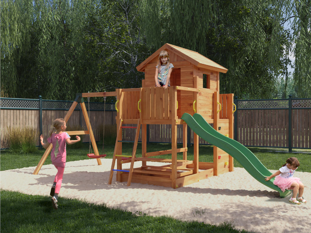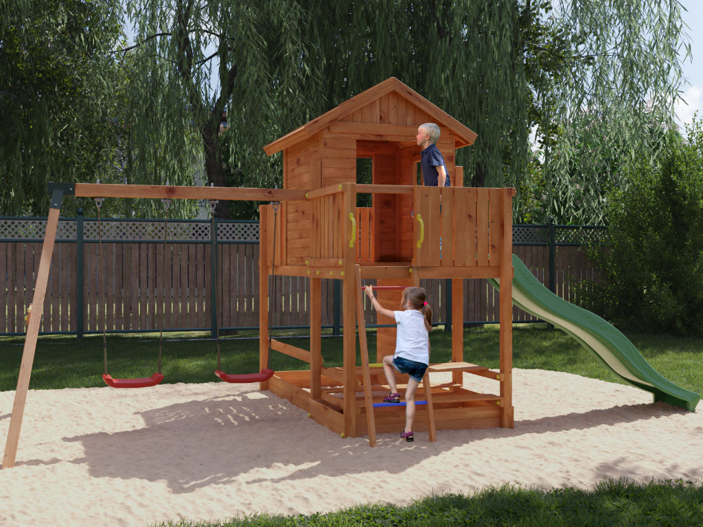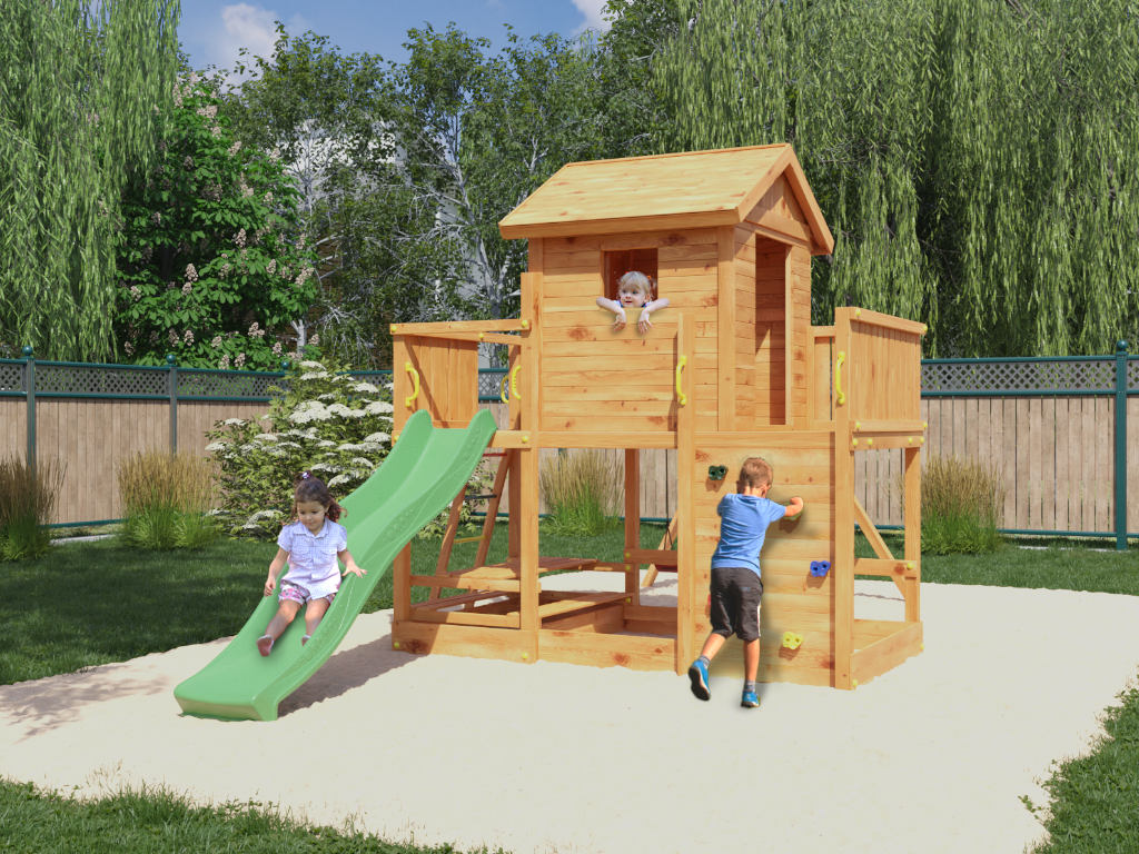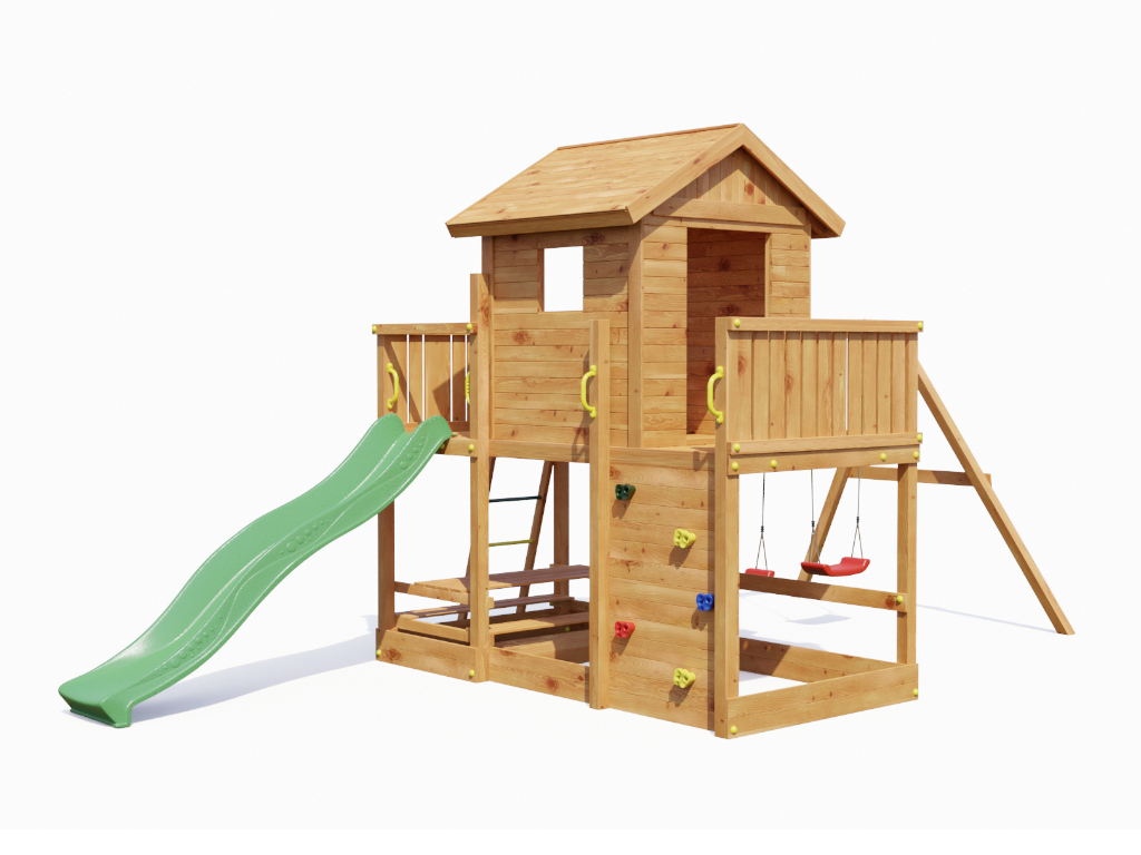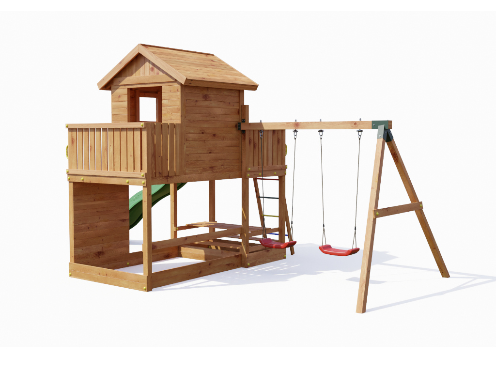 Deze speeltoren combineert speeltoren met speelhuis. De speeltoren heeft twee platforms die aan de ene kant via een ladder en aan de andere kant via een klimwand met klimstenen beklommen kunnen worden. Het platform kan optioneel worden uitgebreid met een glijbaan (niet meegeleverd). Op het platform staat een overdekt speelhuis met twee ingangen en een raampartij. - Incl. zandbak & picknicktafel