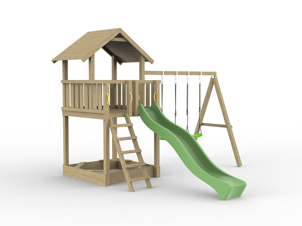 Speeltoren Tilly Classic met dubbele schommel, geïmpregneerd, incl. groene glijbaan en groene schomm