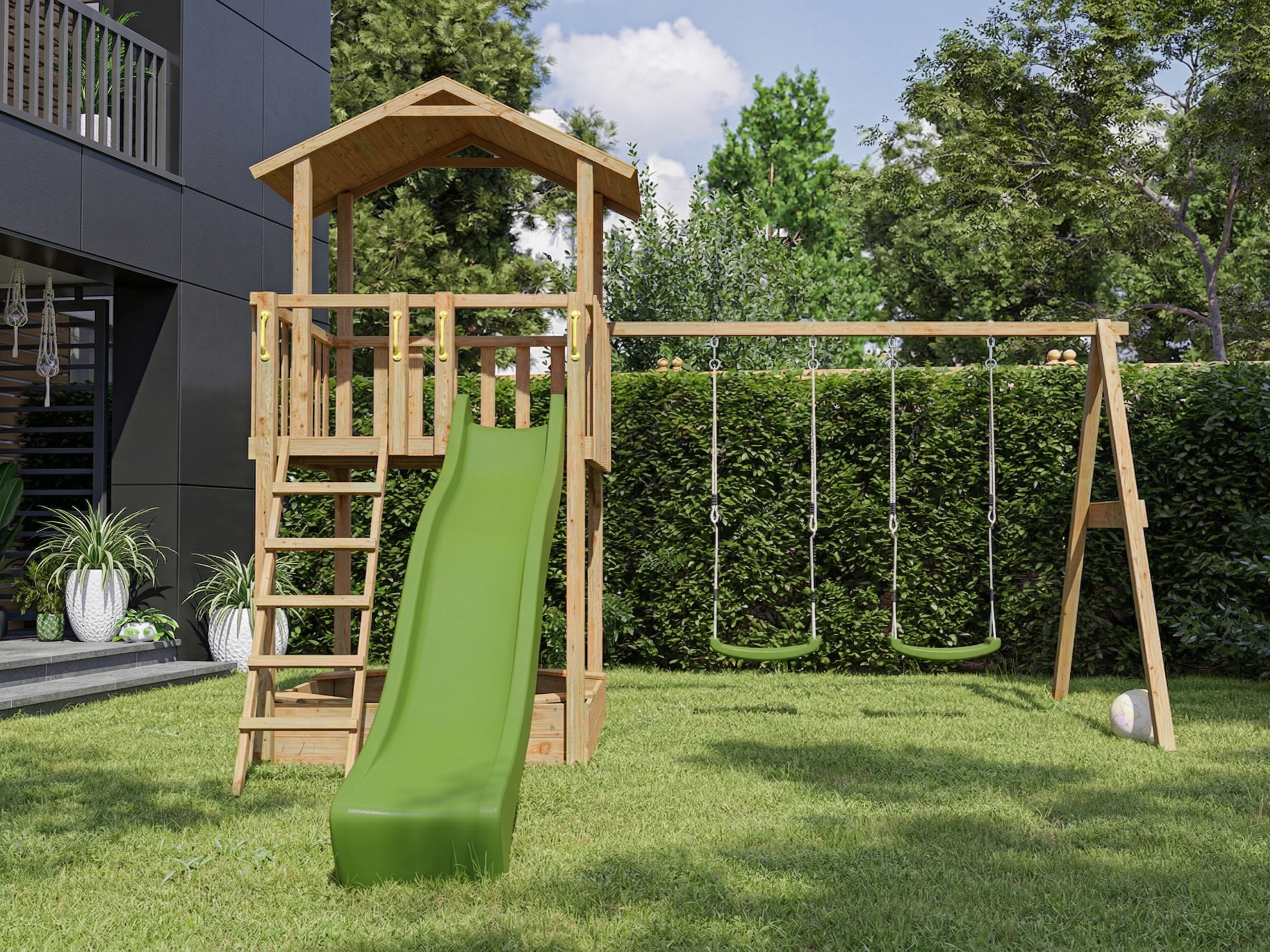 Onder de speeltoren bevindt zich een grote zandbak, die is uitgerust met vier zitplanken. - Individueel uit te breiden