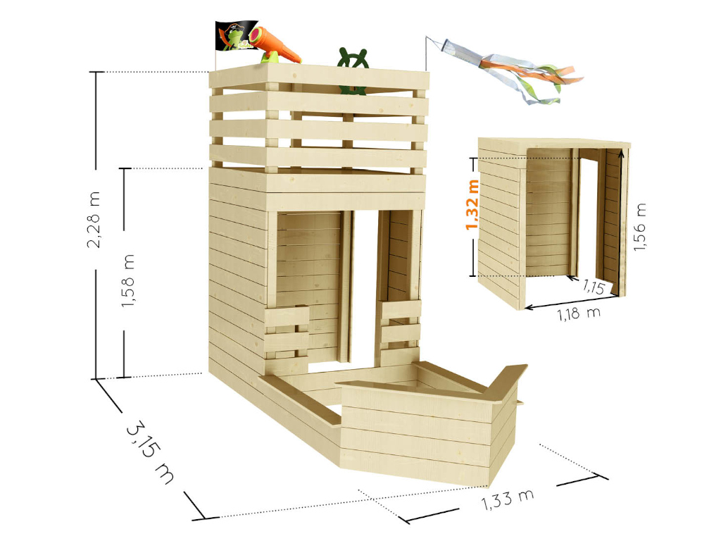 B x D x H: 133 x 315 x 228 cm (incl. zandbak en balkon): De binnenafmetingen van 118 x 115 cm bieden ruimte voor kinderen van alle leeftijden.