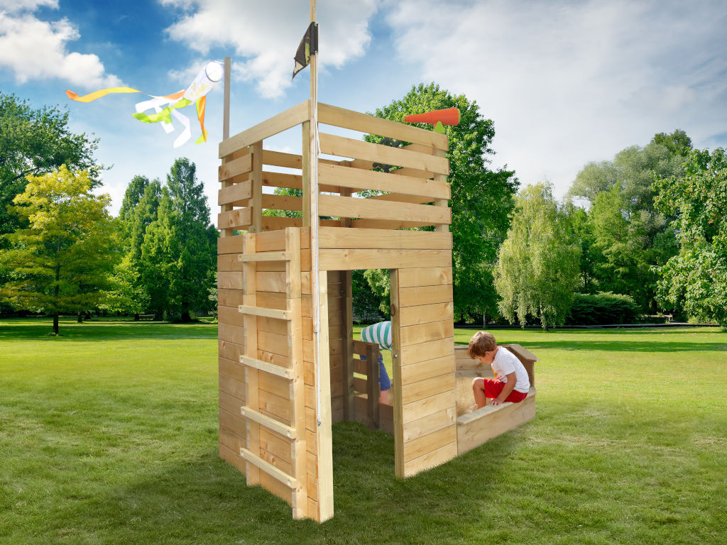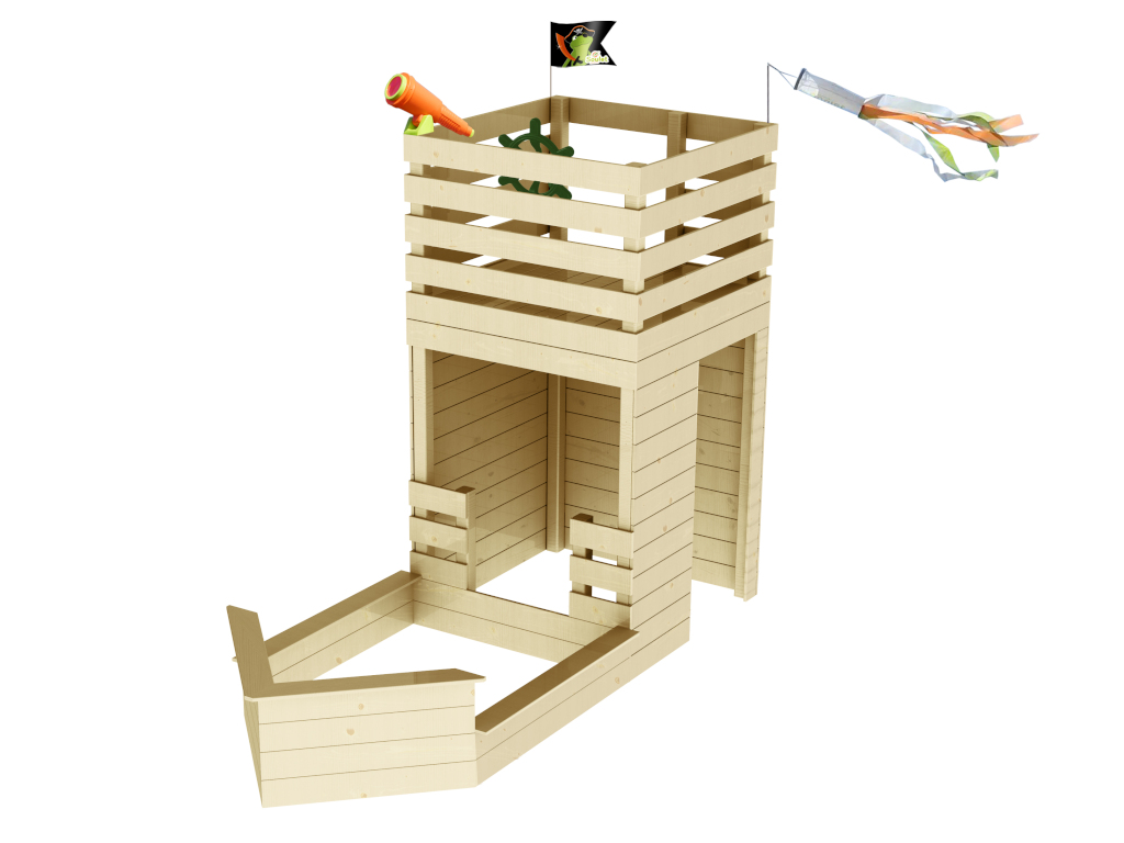 Bij deze speeltoren staat er veel beweging op het programma. Het verhoogde platform van deze speeltoren is op verschillende manieren te bereiken, wat veel spelplezier biedt. Misschien wordt de speeltoren zelfs de centrale ontmoetingsplek voor de kinderen in jouw buurt. Bijzonder hoogtepunt: De speeltoren ziet eruit als een piratenschip - stuurwiel, telescoop en vlag zijn inbegrepen.
