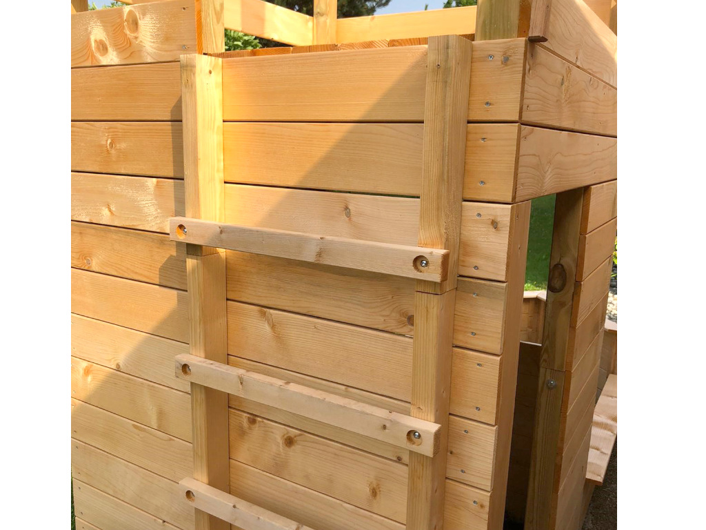 Het gekozen materiaal is natuurlijk, onbehandeld sparren- en dennenhout, dus vrij van chemische impregnatie en absoluut ongevaarlijk. Om de levensduur en weersbestendigheid van het hout te garanderen, raden we aan om het te behandelen met een houtverduurzamingsmiddel zoals een lak of beits. Onbehandeld hout is bijzonder geschikt voor een kleurrijke verflaag.