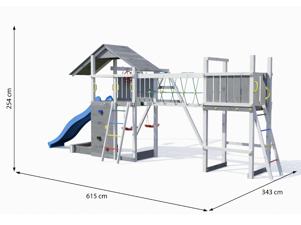 B x D x H: 615 x 343 x 254 cm, Dubbele schommel + brugmodule, incl. Zandbak + klimwand + glijbaan blauw