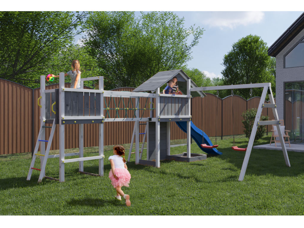 De basisconstructie van de speeltoren bestaat uit 7 x 7 cm dikke palen en is bijzonder weerbestendig, omdat deze gebeitst (kleur grijs/wit). - Eenvoudige constructie