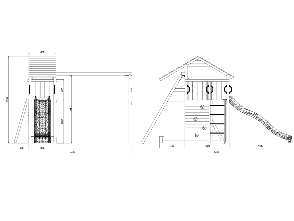 | Leveringsomvang: | Speeltoren, brugmodule met tweede aangebouwd platform, glijbaan, zandbak, dubbele schommel, 2 schommelstoelen, 10 schommelankers, telescoop, stuurwiel, 8 handgrepen, montagehandleiding |