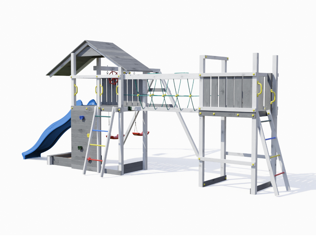 De speeltorenvariant "Bridge" is uitgerust met een brugmodule die de speeltoren met een tweede platform verbindt en zo voor nog meer klimplezier zorgt en tegelijkertijd het evenwichtsgevoel traint.