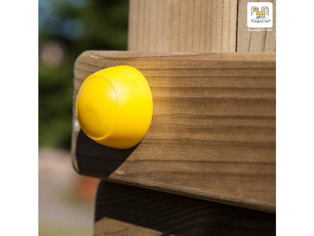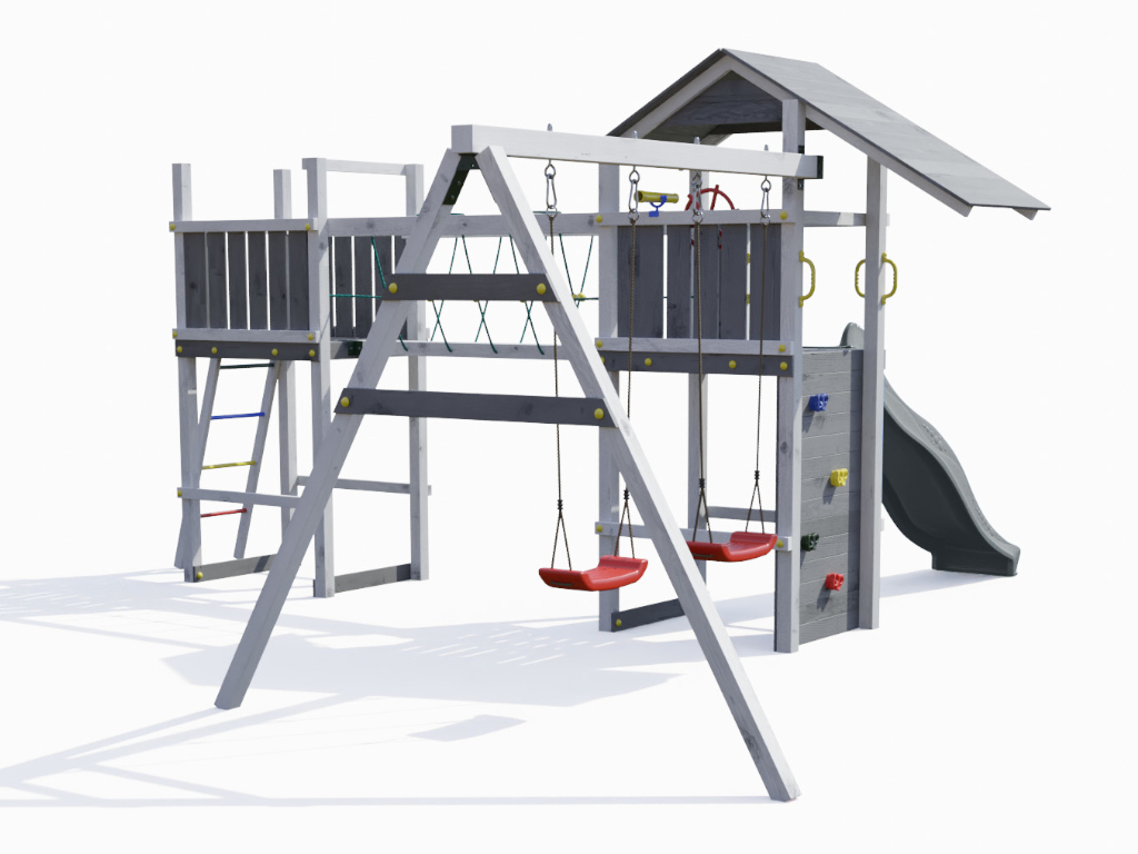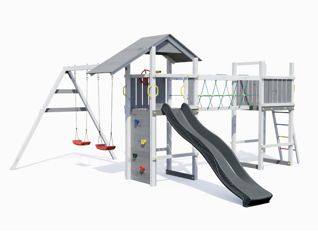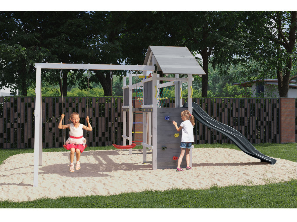 De basisconstructie van de speeltoren bestaat uit 7 x 7 cm dikke palen en is bijzonder weerbestendig, omdat deze gebeitst (kleur grijs/wit). - Eenvoudige constructie