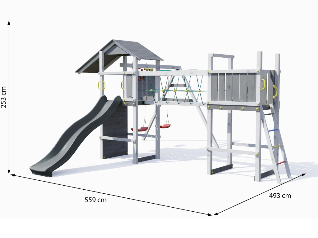 B x D x H: 559 x 493 x 253 cm, incl. Brugmodule + dubbele schommel, incl. Klimwand + glijbaan roze