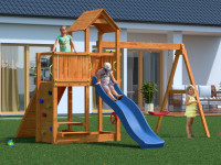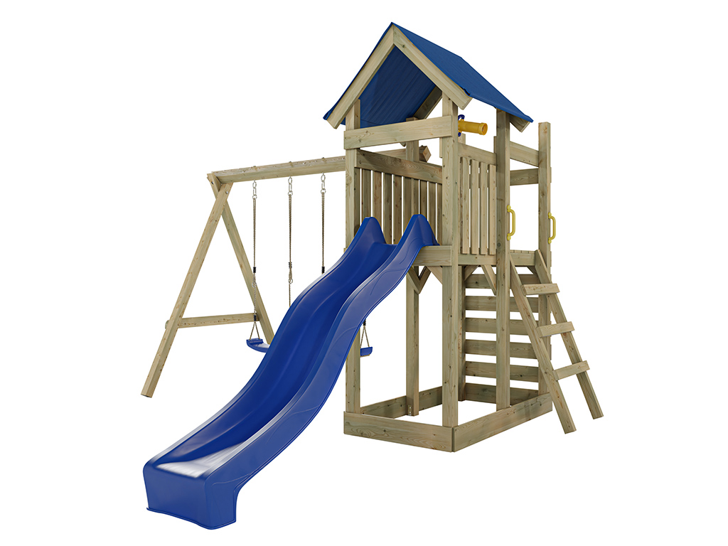 Speeltoren Speedy geïmpregneerd incl. dubbele schommel, blauwe glijbaan en blauwe schommelzitjes