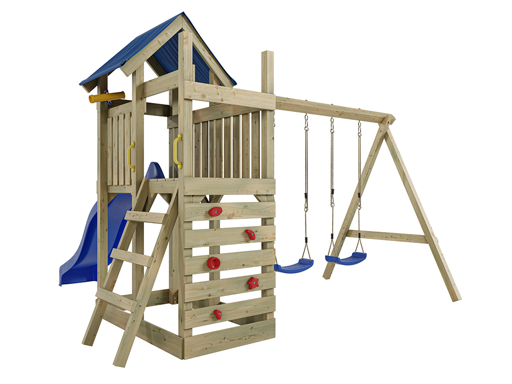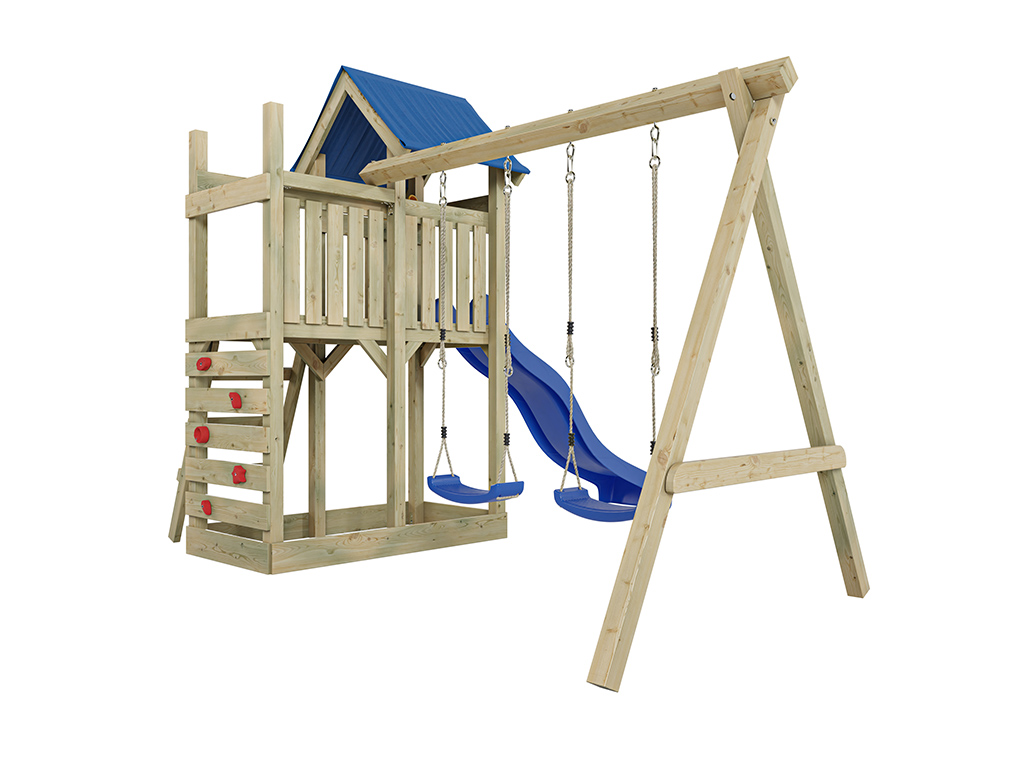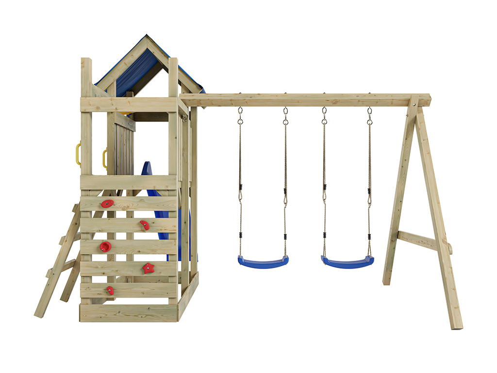 - Inclusief een blauwe dubbele schommel met een stevige schommelbalk van 9 x 9 cm.