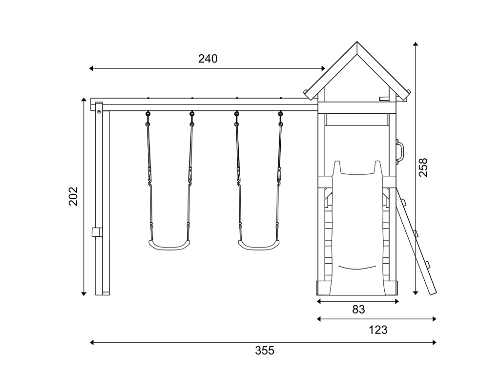 B x D x H: 355 x 386 x 258 cm, incl. klimwand, incl. blauwe glijbaan + blauwe schommelzitjes