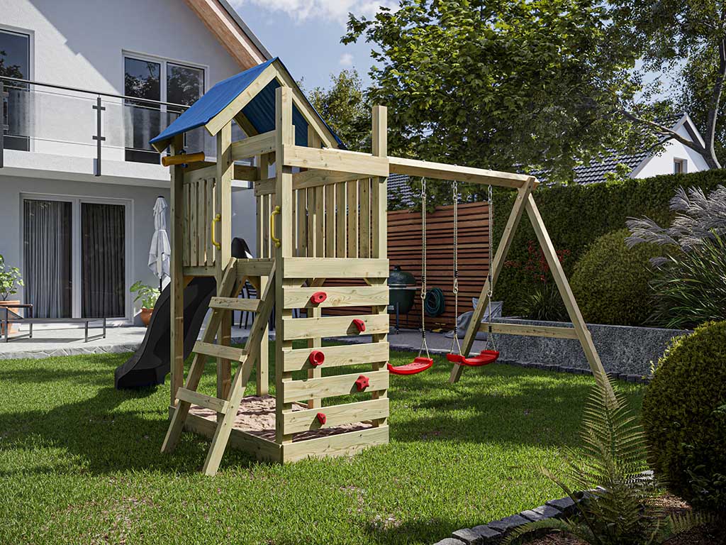 | Leveringsomvang: | Speedy KDI speeltoren, dak van zeil, platformverlenging, dubbele schommel, 2x schommelzitje of 1x nestschommel (afhankelijk van keuze), 4 schommelhaken, 2 handgrepen, zandbak, ladder, klimwand, klimstenen, 1x telescoop, 1x glijbaan |