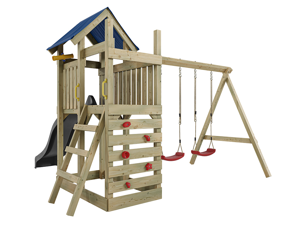 - Speeltoren Speedy, geïmpregneerd, doekdak, dubbele schommel, 2x schommelzitje of 1x nestschommel (afhankelijk van je keuze), 4 schommelhaken, 2 handgrepen, zandbak, ladder, klimwand, klimgrepen, 1x telescoop, 1x glijbaan