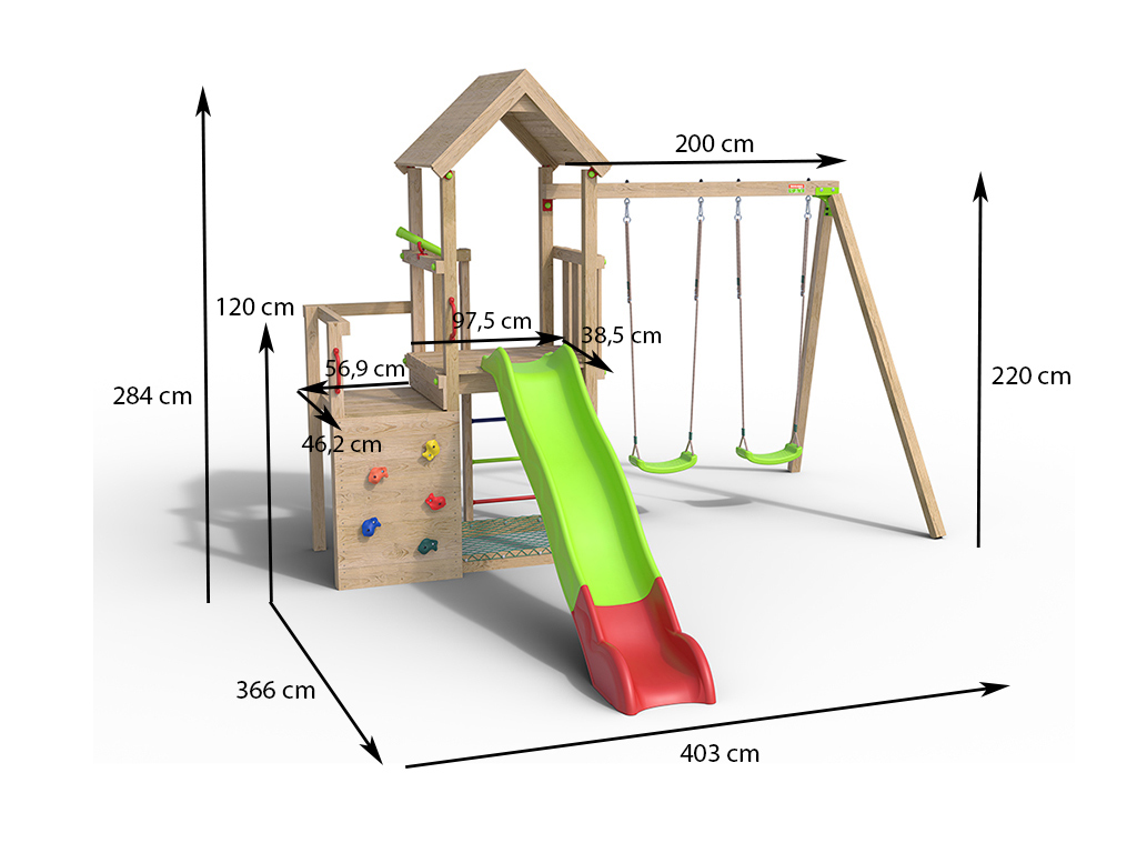 B x D x H: 403 x 366 x 284 cm, incl. Glijbaan + dubbele schommel, incl. Klimwand + zandbak + telescoop en nog veel meer.