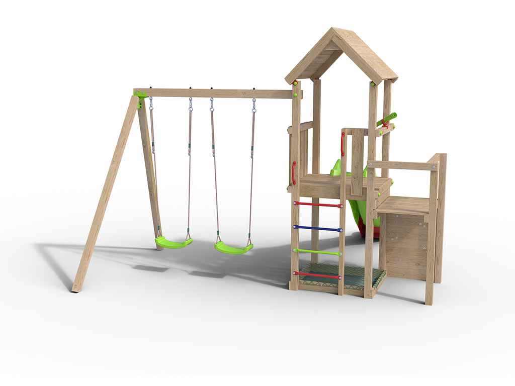 Als ideale uitbreiding van je speeltoren bevat deze een dubbele schommel met bijpassende groene schommelzitjes. Voor nog meer plezier voor je kinderen. De basisconstructie van de schommelaanbouw bestaat uit een 9 x 9 cm dikke dwarsbalk en 7 x 7 cm dikke paal. De schommelzitjes zijn in hoogte verstelbaar. De metalen verbindingsdelen worden in groen geleverd.